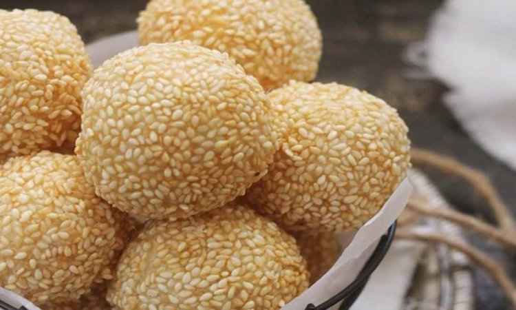 - Celupkan bulatan tersebut kedalam sedikit air kemudian gulingkan pada wijen.